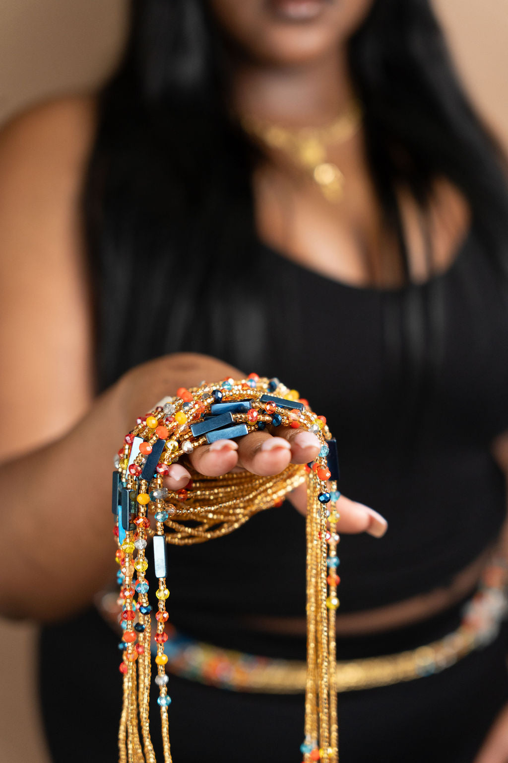 Our waist beads come strung on pure cotton thread or fishline. the beads are manufactured in Ghana and consist of crystals, stones and glass beads. Our beads do not fade and wash easily in the shower