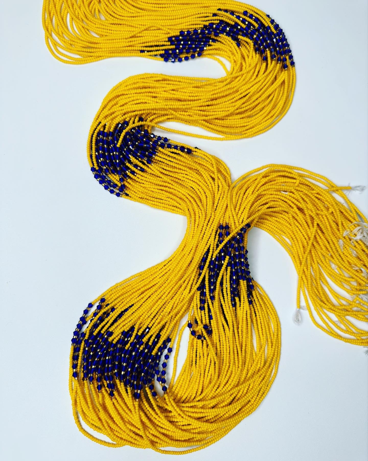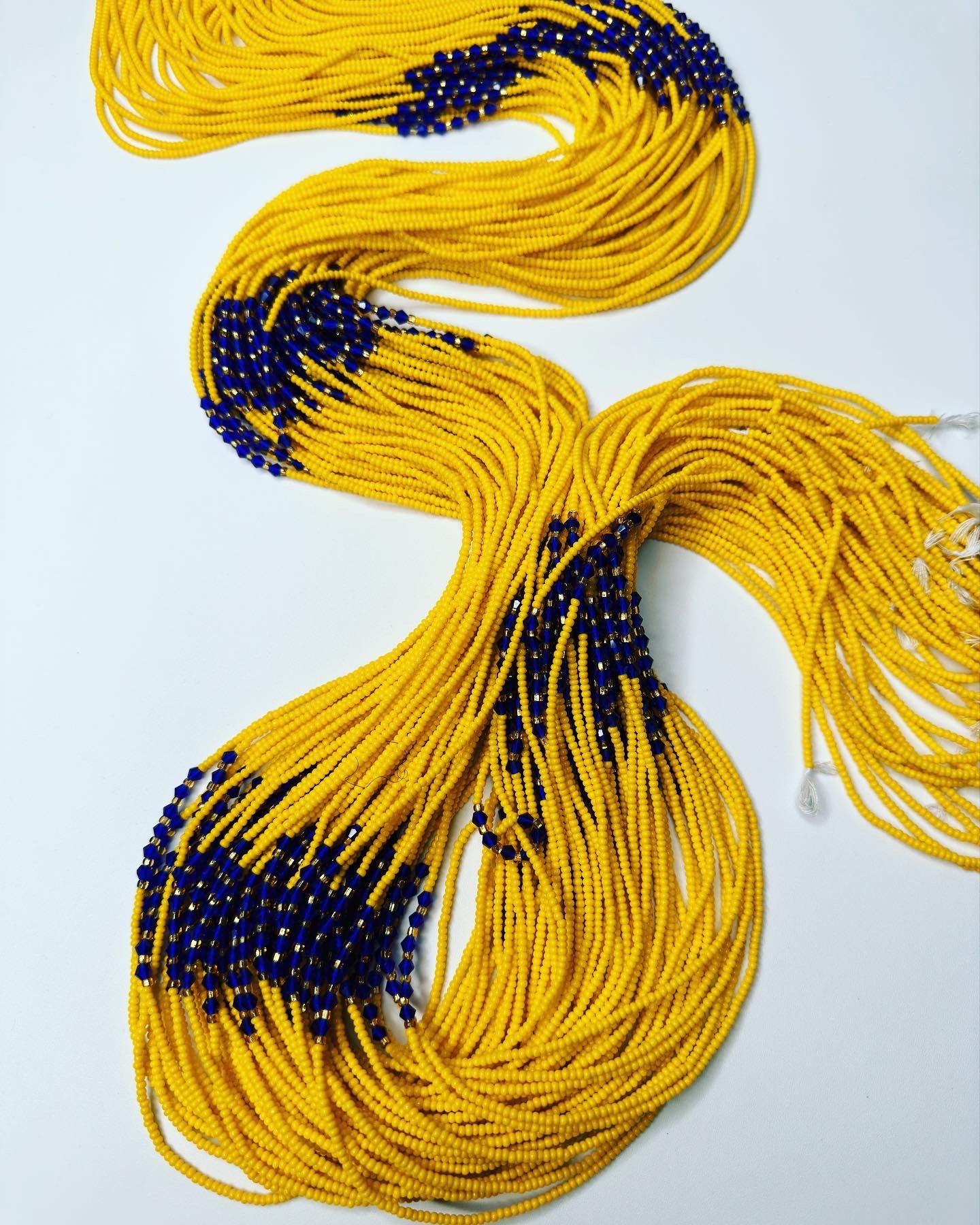 Our waist beads come strung on pure cotton thread or fishline. the beads are manufactured in Ghana and consist of crystals, stones and glass beads. Our beads do not fade and wash easily in the shower