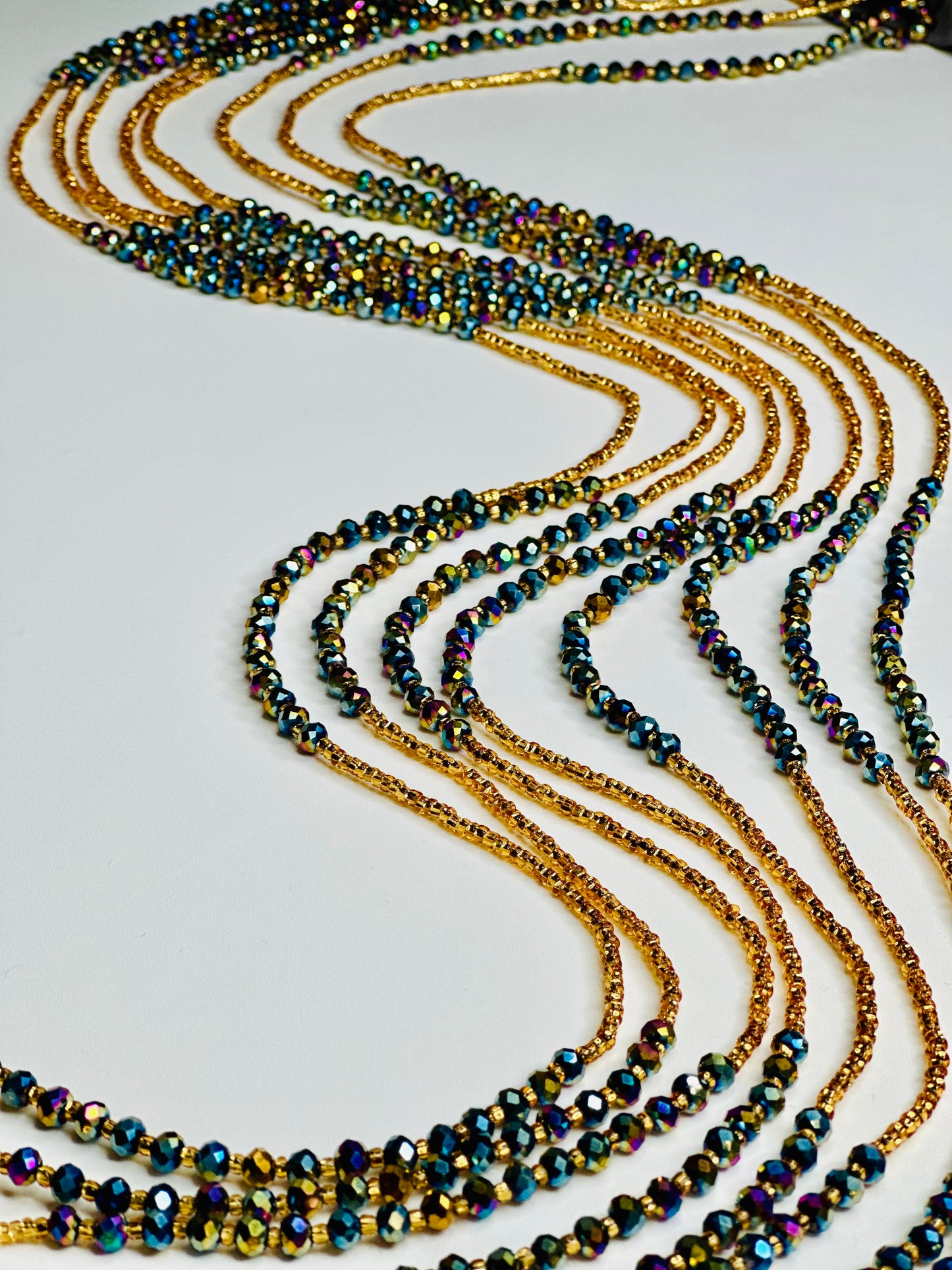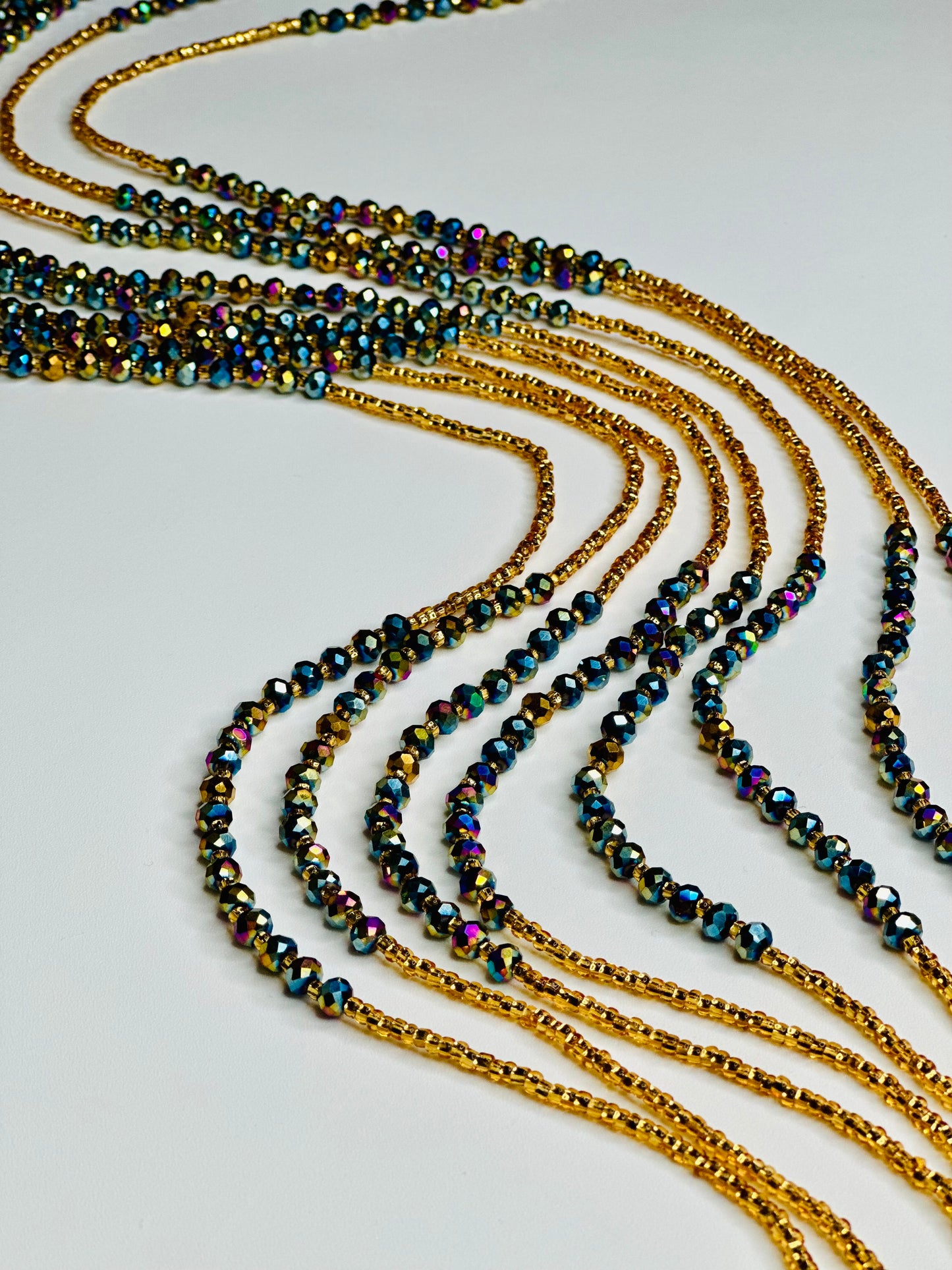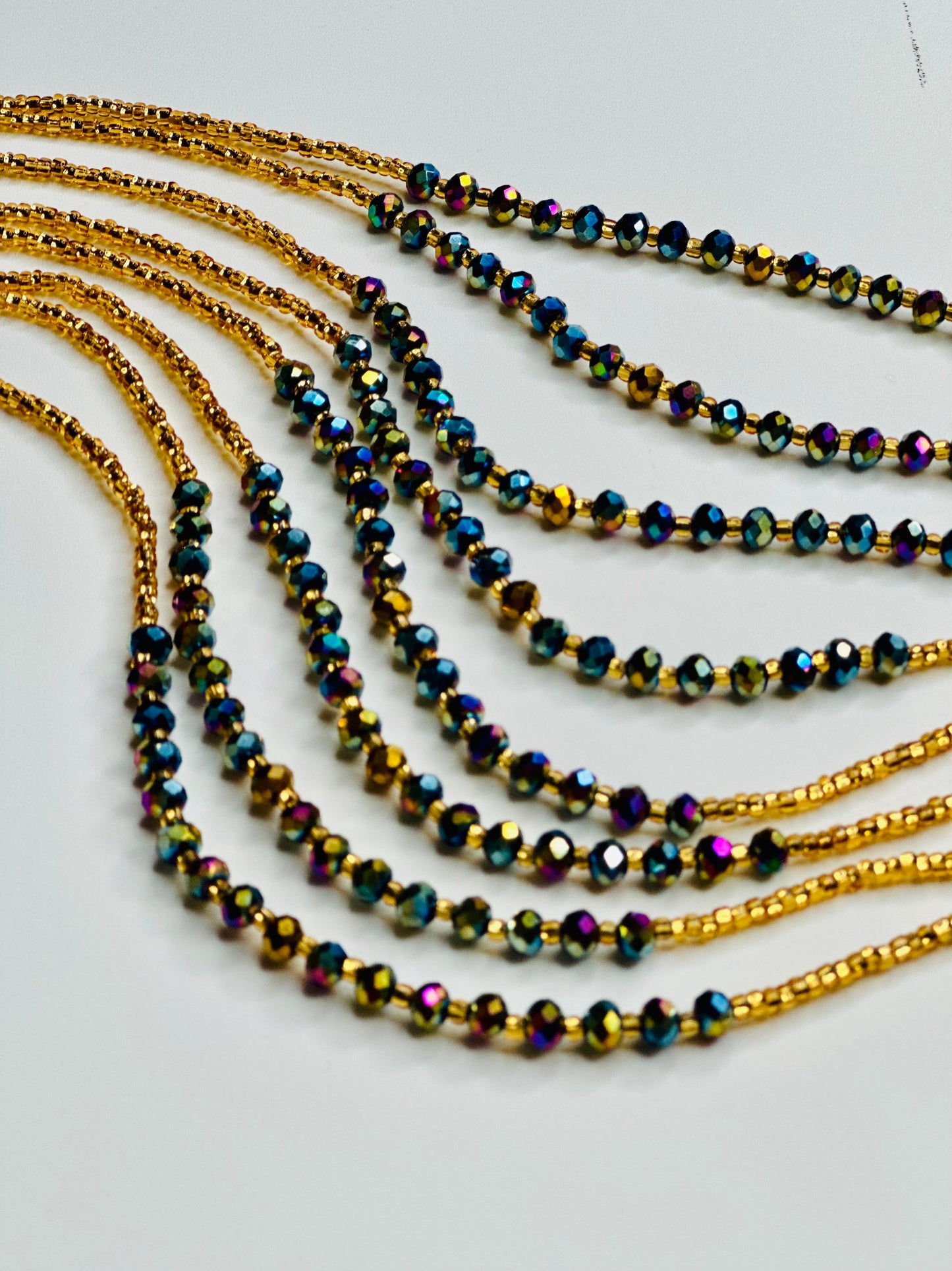 Our waist beads come strung on pure cotton thread or fishline. the beads are manufactured in Ghana and consist of crystals, stones and glass beads. Our beads do not fade and wash easily in the shower